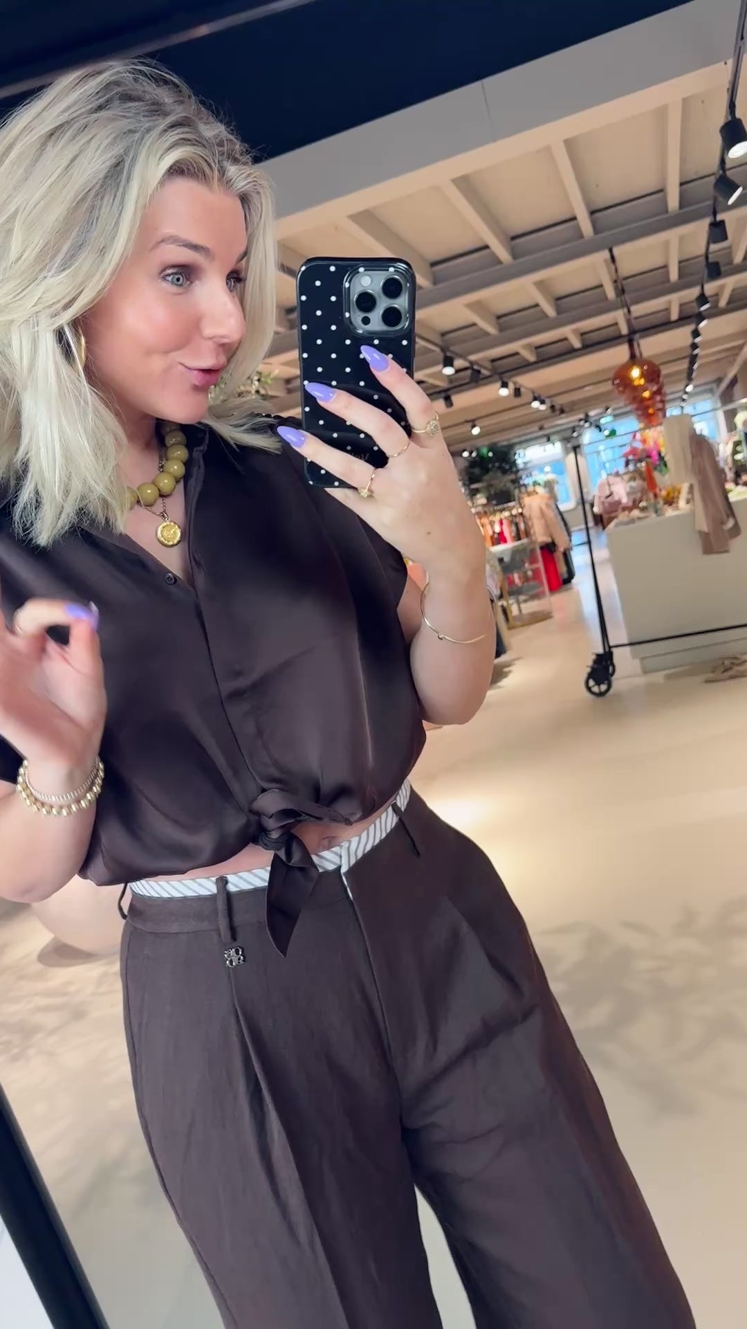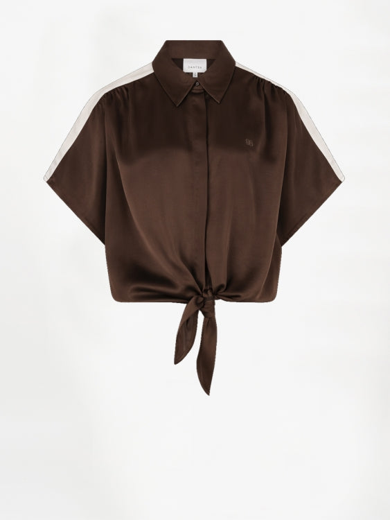 De Siren blouse in Chocolate Brown is een sportieve basic met een twist. Gemaakt van gecertificeerd gerecycled satijn met mechanical stretch. De schouders zijn licht gerimpeld, de klassieke kraag komt mooi uit dankzij de blinde sluiting en de cropped lengte geeft de blouse een moderne vorm. Het knoopdetail aan de voorkant en het contrasterende paneel op de rug geven de blouse karakter en een relaxte, eigentijdse uitstraling.