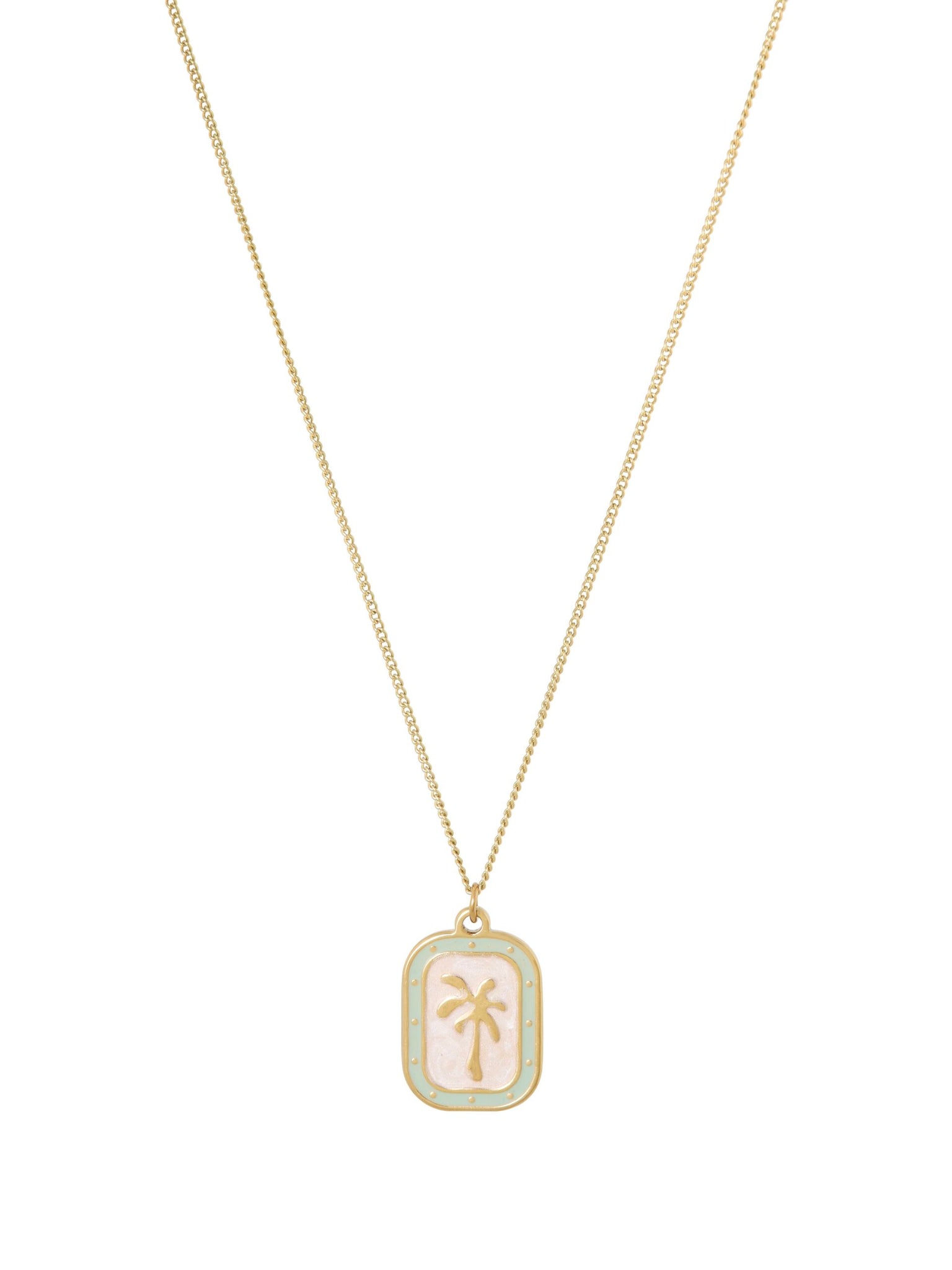 Prachtige vergulde ketting met daaraan een rechthoekige palm hanger. De hanger heeft prachtige pastel tinten en meet 2.8 x 1.3 cm. De lengte van de ketting is 20 inch (50cm).