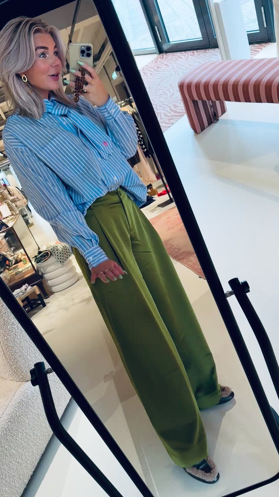 Satijnen broek vervaardigd van een glanzende stof met gerecyclede polyester. Hij is voorzien van weldoordachte plooien in de taille die overgaan in losvallende brede pijpen. Hij is afgewerkt met twee paspelzakken achteraan, schuine steekzakken vooraan en een rits- en knoopsluiting.
