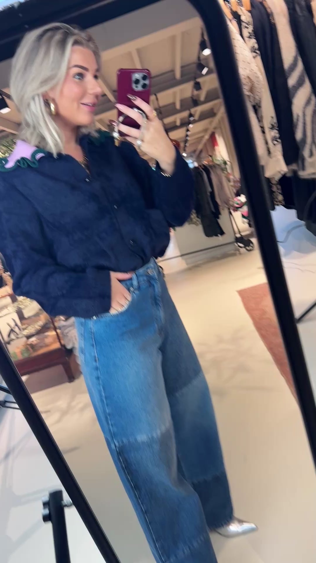 Cardigan met tactiele afwerking, ontworpen met een knoopsluiting aan de voorkant en twee opgestikte zakken. De gebreide kraag in contrasterende kleur en de kleurrijke volantrand geven het ontwerp extra karakter en textuur.