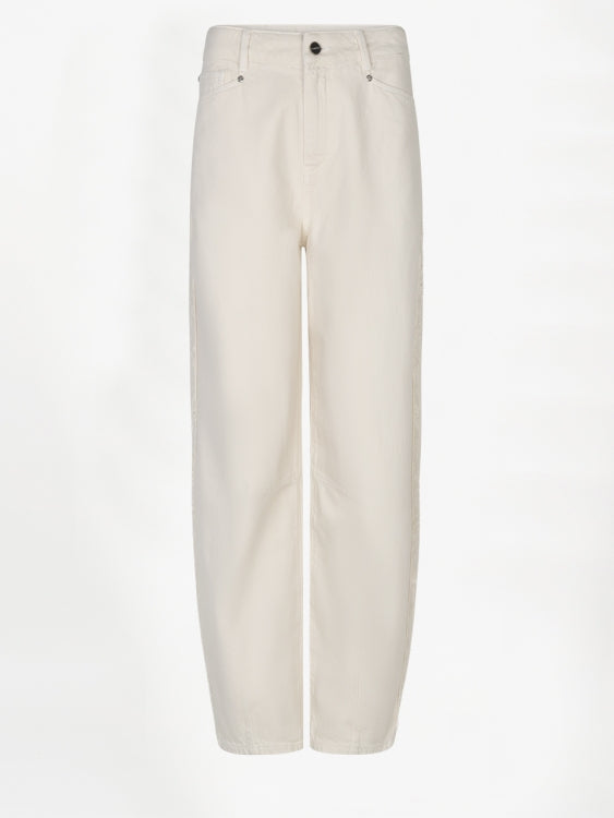 De Brave jeans in off-white geven een frisse kijk op classic denim. De relaxed barrel-leg pasvorm heeft een signature five-pocket design en is gemaakt van een blend van organic cotton en lyocell voor een zachte maar gestructureerde feel. De fringed details langs de zijnaden zorgen voor een opvallend detail met subtiele beweging.