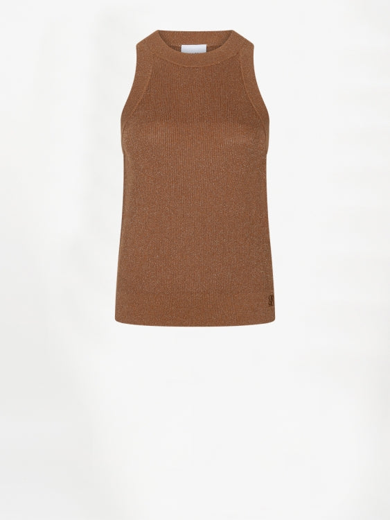 De Noki top in oranje is een metallic gebreide top met een verfijnde uitstraling. De ribstructuur benadrukt de slim fit en zorgt voor een clean silhouet. Ontworpen met een ronde hals en mouwloze pasvorm voor een moderne, veelzijdige look. Makkelijk los te dragen of te combineren onder een blazer.