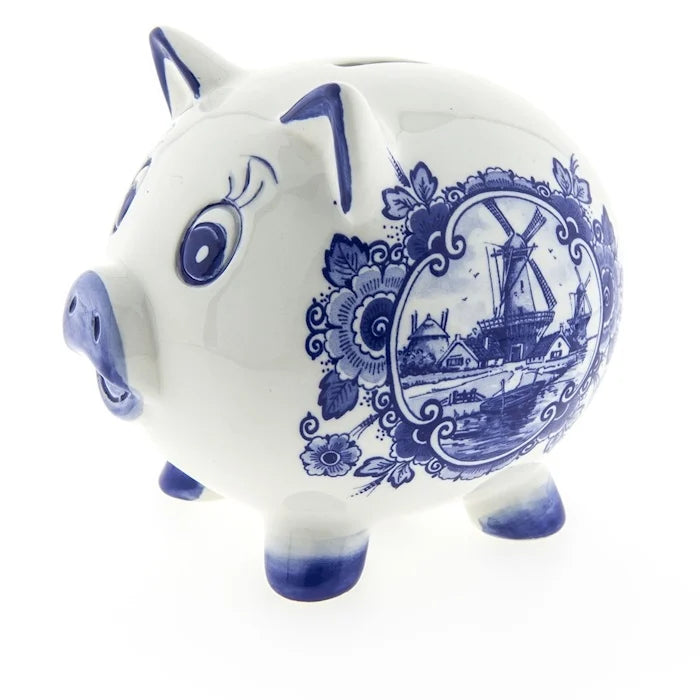 Een echt Delfts blauw spaarvarken met een molen op z’n buik. Aan de onderkant van de buik zit een gat met een zwarte rubber dop, zodat het geld eruit kan zonder de pot te breken.