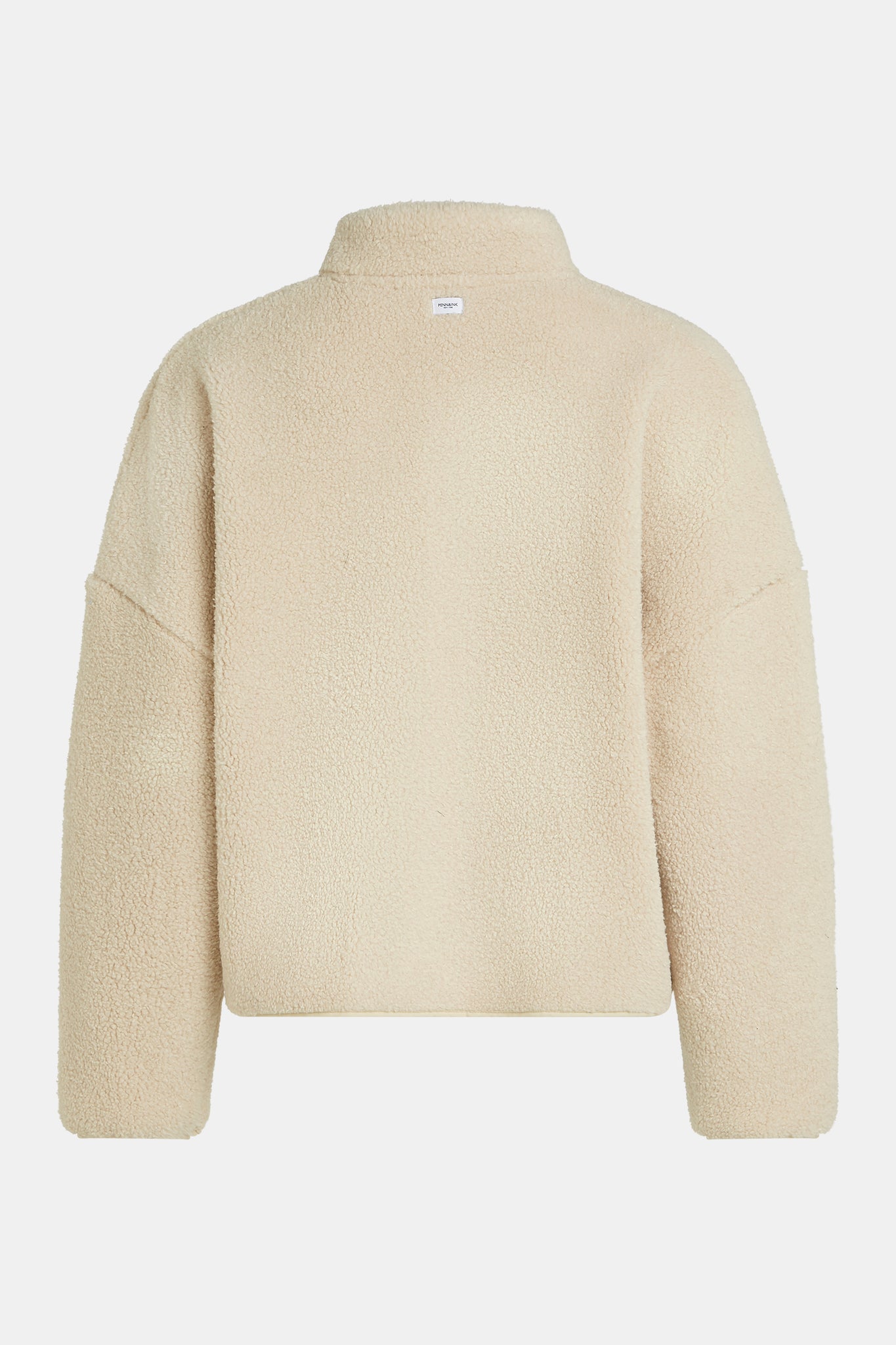 Deze teddyjas heeft een charmante opstaande kraag en een eenvoudige knoopsluiting. De zachte, donzige textuur biedt behaaglijke warmte en een stijlvolle, relaxte look. Perfect om op koude dagen over andere kleding heen te dragen.
