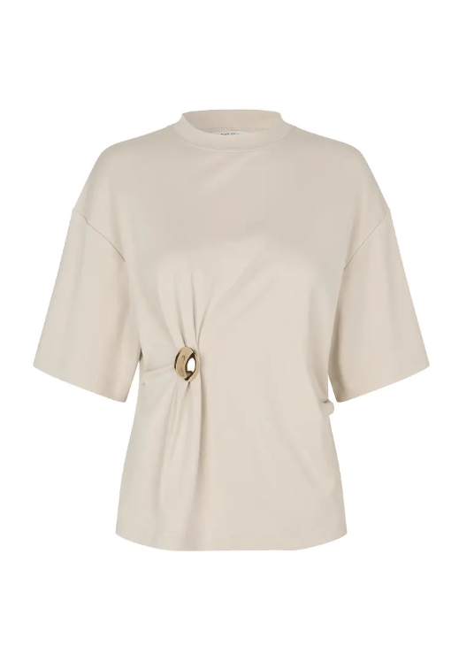 Second Female T-shirt met broche. Het T-shirt is gemaakt van een zachte en rekbare lyocell-katoenmix. Met ronde hals en gerimpeld detail aan één kant met afneembare gouden broche. Verlaagde schouders en korte mouwen. Normale pasvorm.