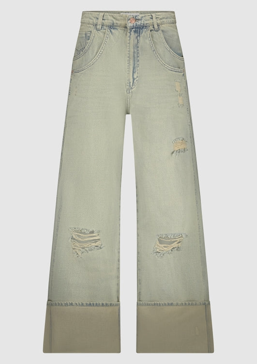 De Luxx is onze wide leg denim met dubbele steekzakken aan de voorkant en een omslag onderaan de broekspijpen. De broek heeft een verwassen groenblauwe tint met beschadigde details.