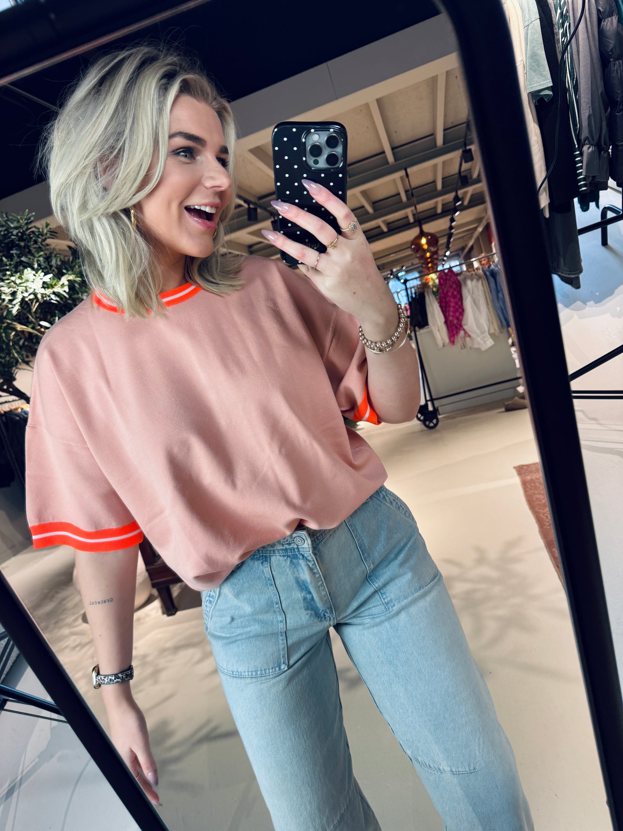 Gebreide top met relaxte pasvorm, afgewerkt met een contrastboord aan de mouwuiteinden en halslijn voor een moderne uitstraling. Hij is speels afgewerkt met een ritsdetail en lint op de rug. Hij is vervaardigd van een losvallende stof met toch wat structuur, waardoor hij prachtig valt in een flatterend silhouet. Te combineren met een kleurrijke rok of geklede broek voor een statement look.