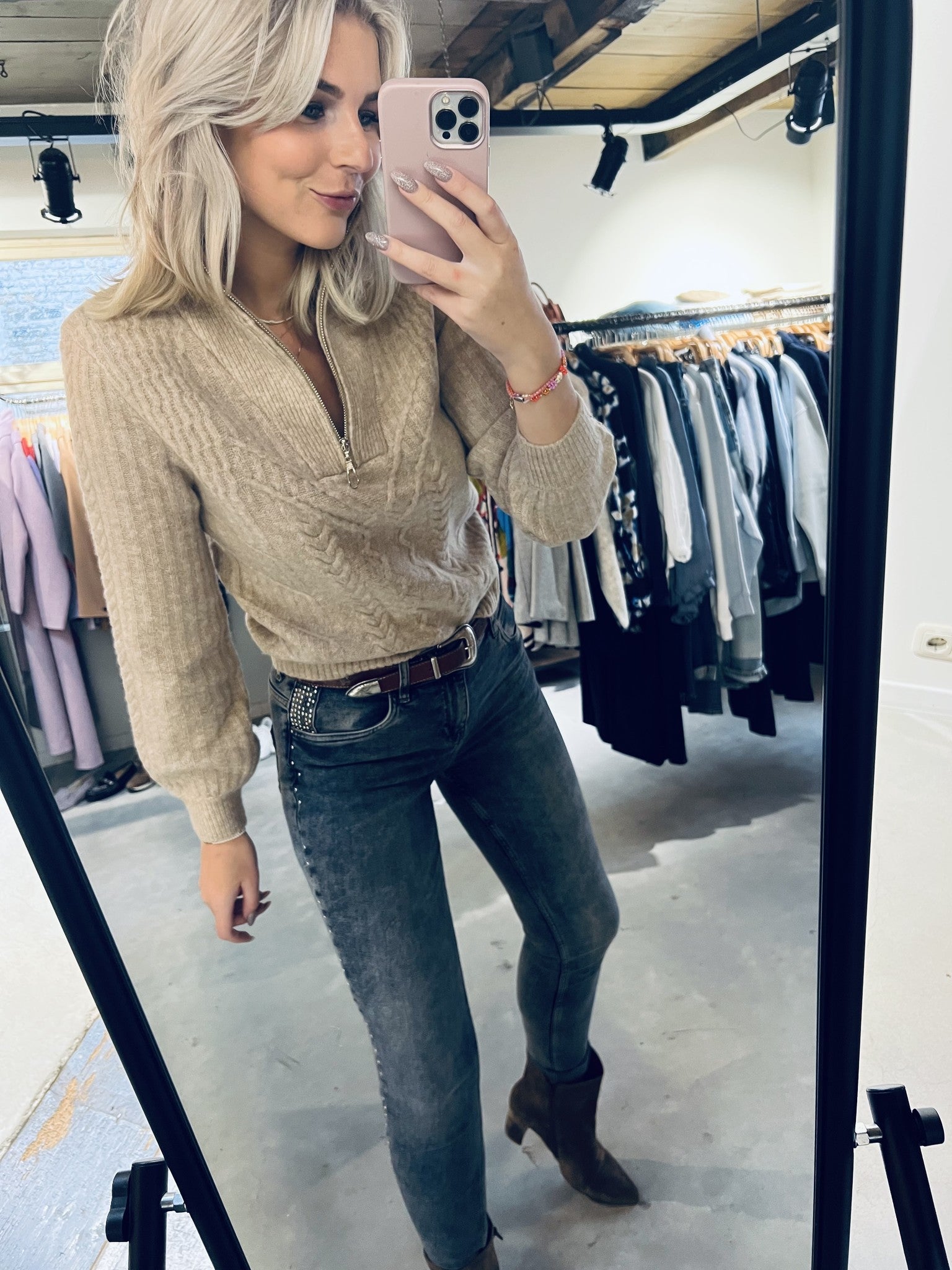 Deze jeans is gedetailleerd met een leren badge op de achterkant, studs op de voorzakken en op de pijpen.