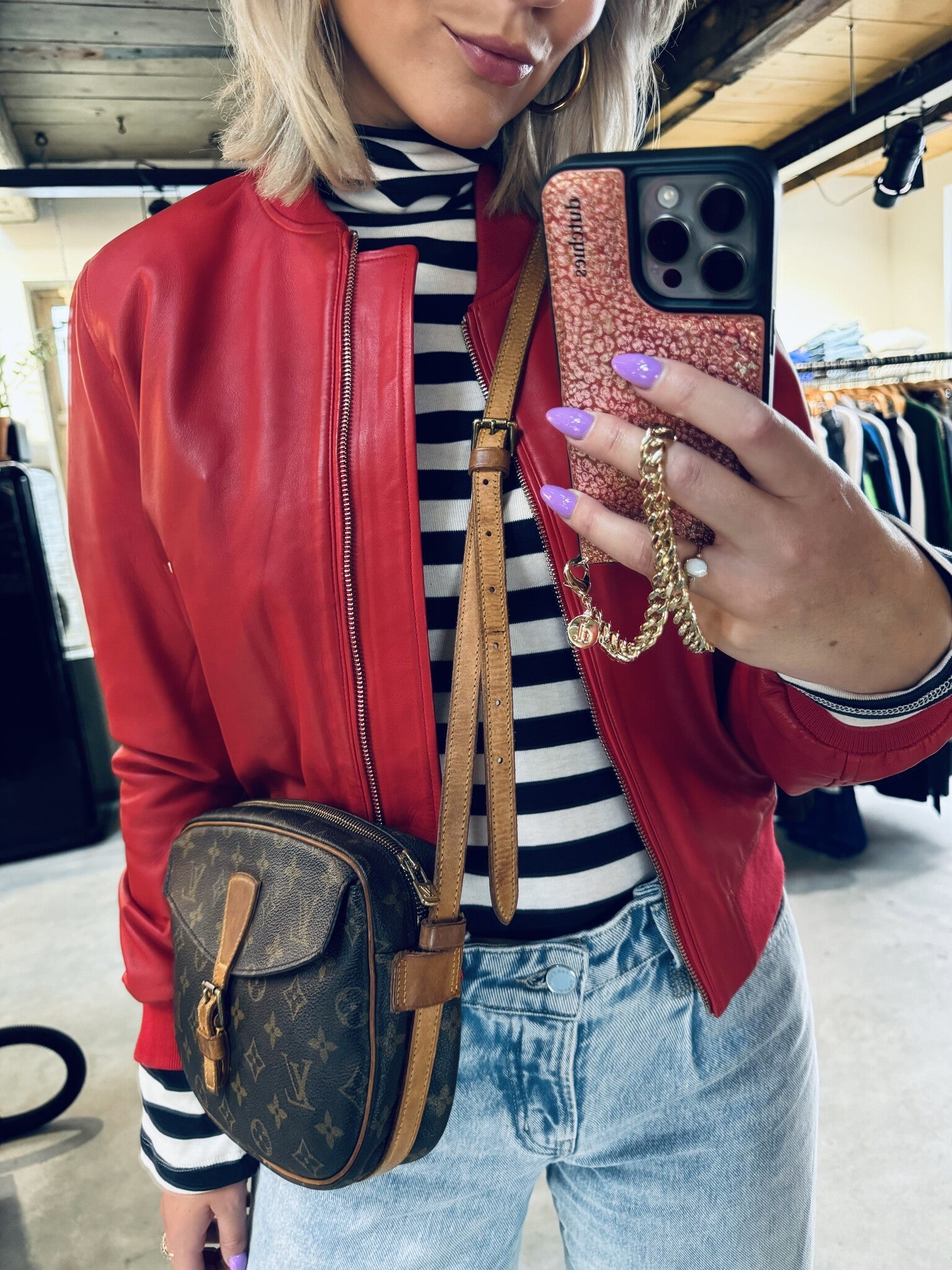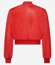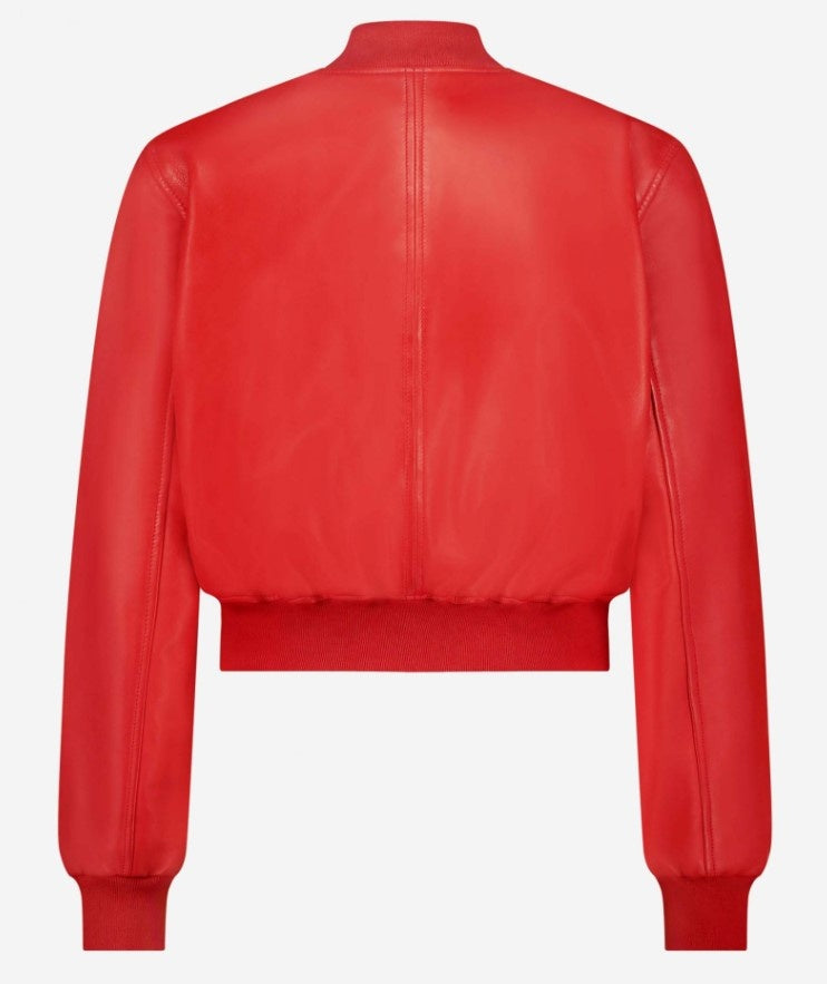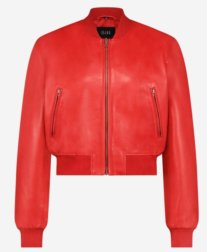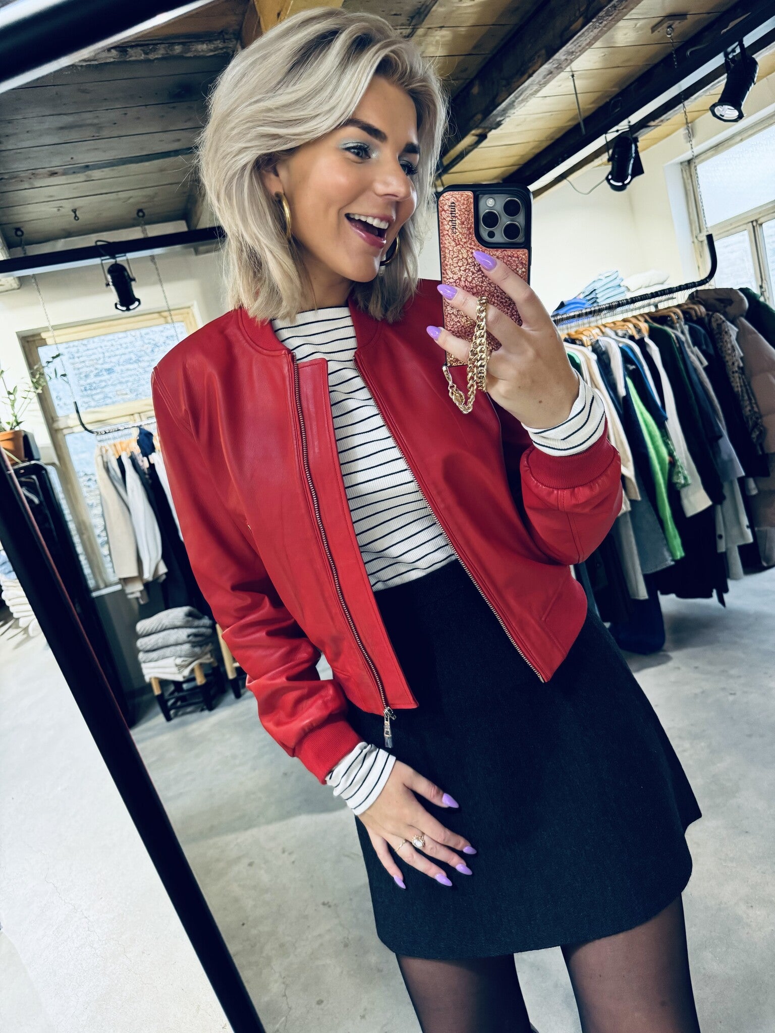 De favoriete bomberjas dit seizoen is de Jecksy in de kleur Red Bomb. Hoe geweldig is deze kleur? De bomber is gemaakt van hoogwaardig kwaliteitsleer, bevat gouden ritsen en elastische boorden aan de onderkant en mouw uiteindes