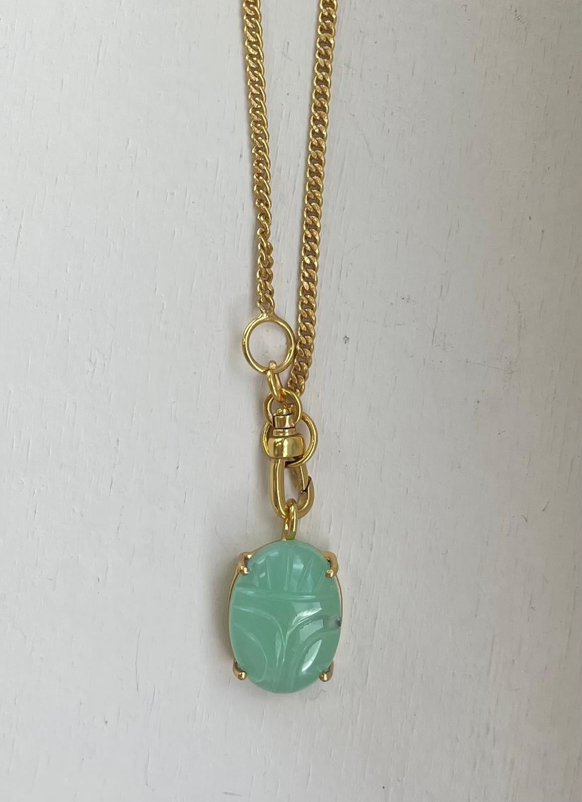 Mooie lange fijne schakelketting met groene edelsteen bedel.
