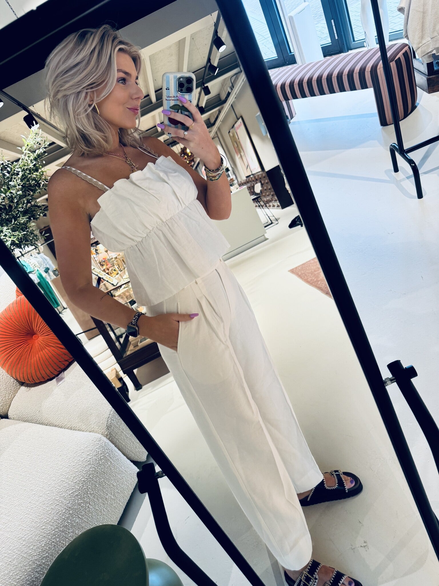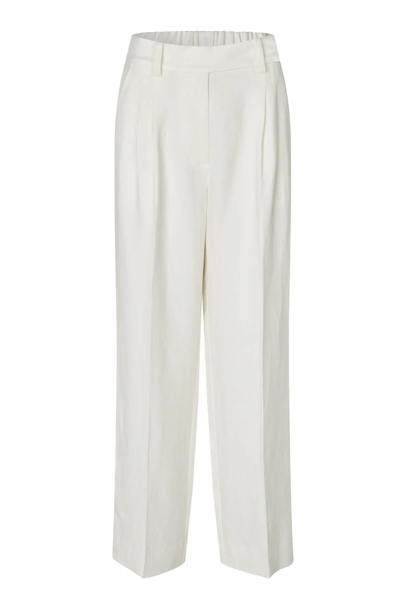 Second Female broek met wijde pijpen. De broek is gemaakt van een stoffenmix met linnen textuur. De broek heeft een blinde rits-, haak- en knoopsluiting aan de voorkant en elastiek aan de achterkant. Twee schuine zakken aan de voorkant en twee sierzakken aan de achterkant. Midden in de taille met wijde, rechte pijpen.