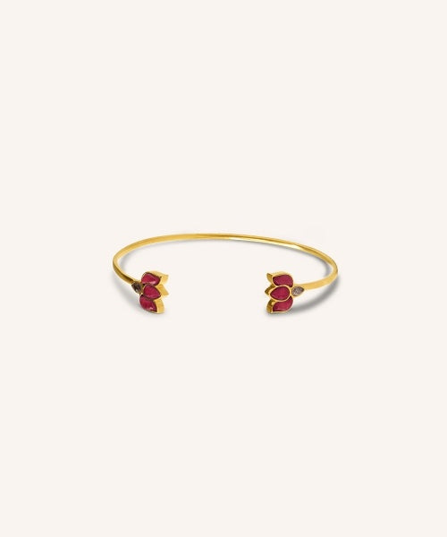 Golden eyecatcher! De lotus bracelet is gemaakt van nikkelvrij koper met een laagje verguld goud met milky beads. De armband is opengewerkt en heeft one size.