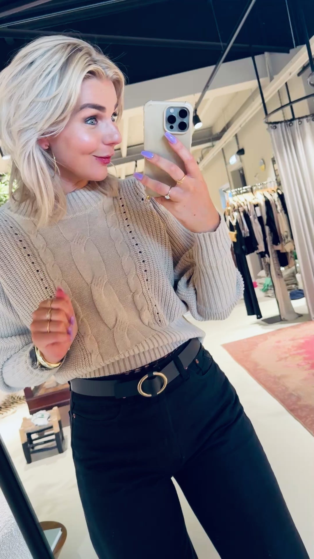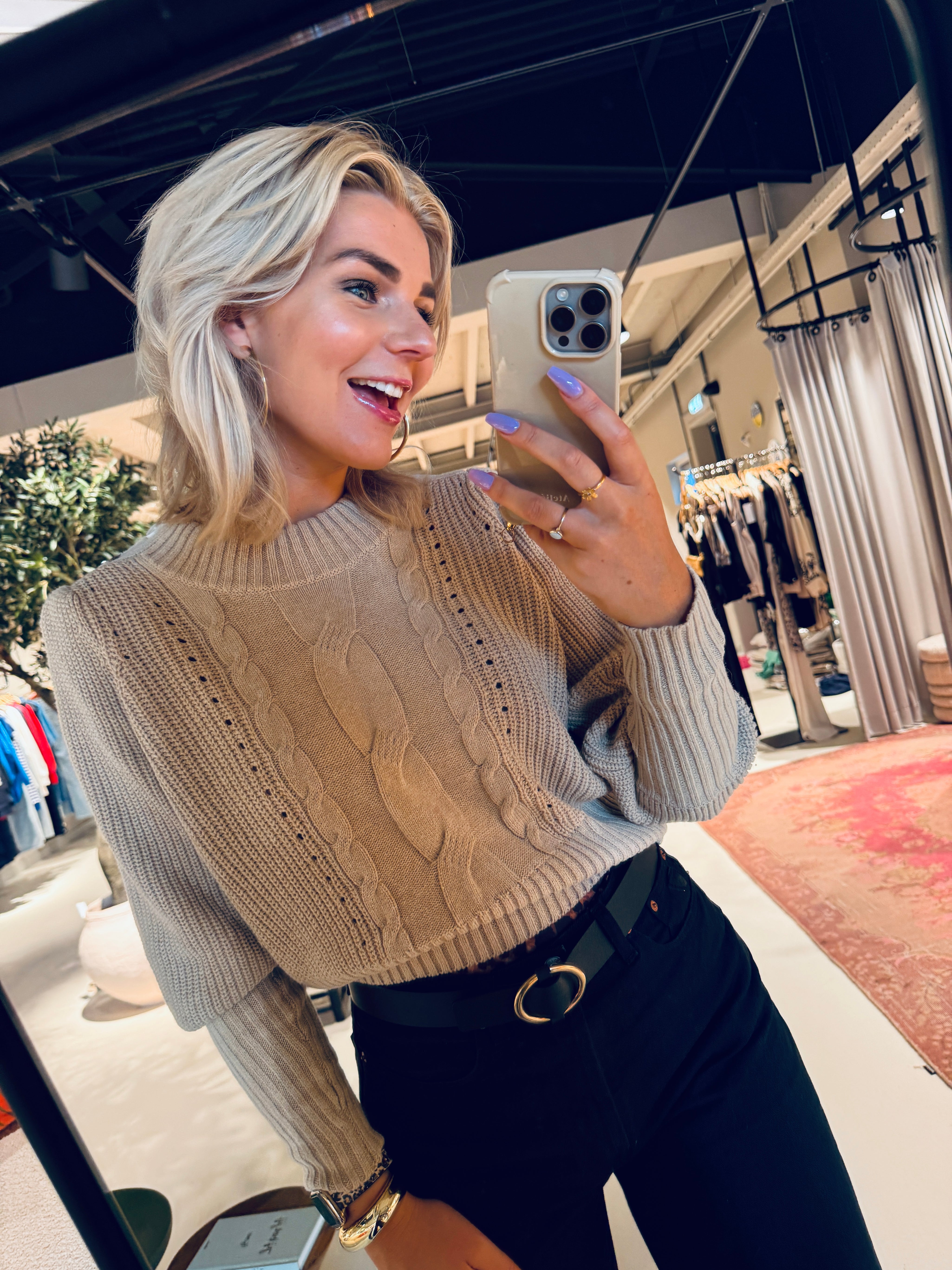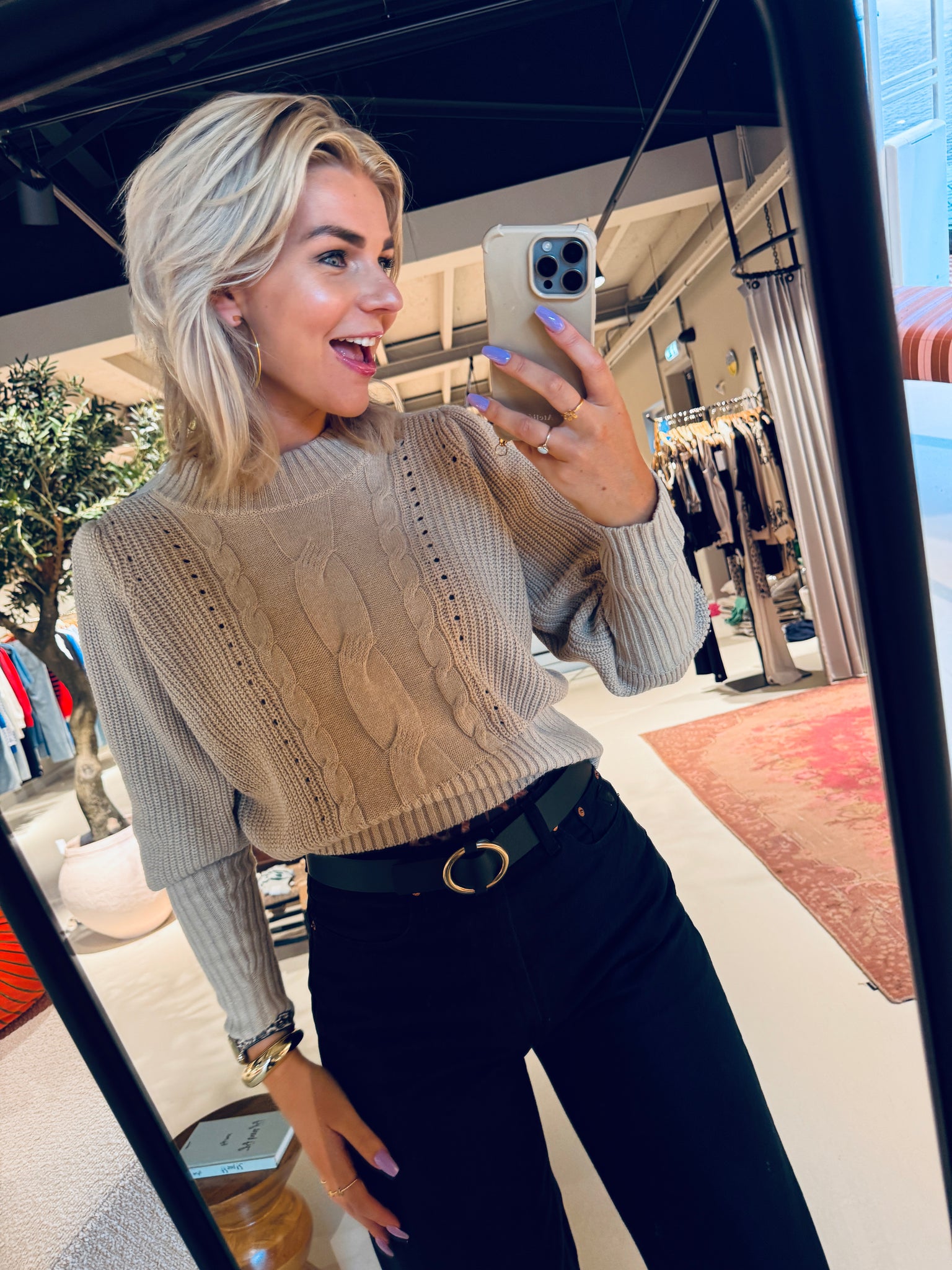 Een mooie kabelgebreide trui met elegante, wijde mouwen en een fijne, hoge ribboord aan zowel de manchetten als de zoom. De trui is daarnaast ontworpen met een stijlvolle knoopsluiting bij de halslijn.