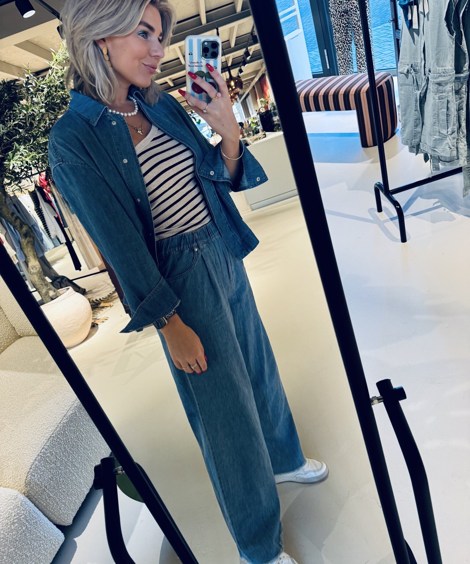 Maak kennis met Sun, de perfecte mix van stijl en comfort. Ze is gemaakt van zachte, flexibele denim, ontworpen voor bewegingsgemak en een coole, relaxte uitstraling. Haar raw-edge zomen voegen een unieke touch toe en de elastische tailleband zorgt voor een comfortabele pasvorm. Met riemlussen kun je ervoor kiezen om de tailleband te tonen of te verbergen, afhankelijk van je look. Voor een complete outfit combineer je Sun met jack Finn.